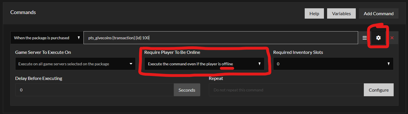 4. Click the gear icon to the right of the command, and set "Require Player To Be Online" to "Execute command even when player is offline" <br>